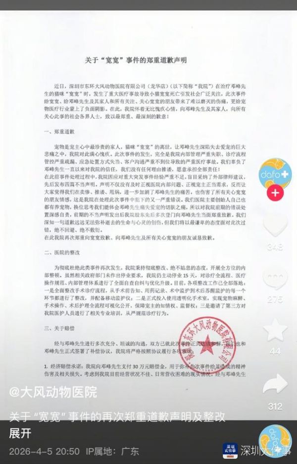 3月初,涉事宠物医院深圳市东环大风动物医院有限公司就曾发布致歉声明称,医院已全面停业整顿,也将承担相应责任。近日,该院再次于社交平台发布致歉声明称,院方已进行全面整改,一是整改手术诊疗流程,二是正式投入透明化手术室,三是邀请第三方对医护人员进行专业培训。此外,这份声明中还提到,针对“宽宽”主人此前提出的诉求,双方已达成和解,将向宠主赔偿30万元现金,分12期支付,且相应宠主此前提出的诉求,同步开启1100例流浪猫绝育公益项目。