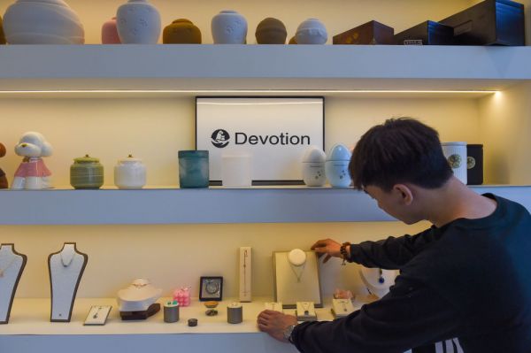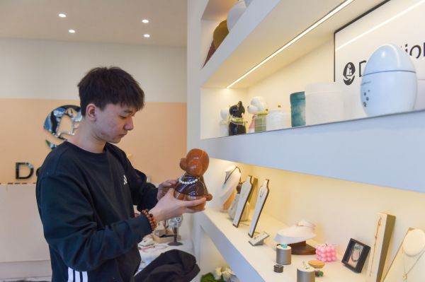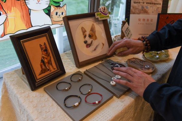 ↑ 4月1日,谷铭泽摆放宠物殡葬衍生品。