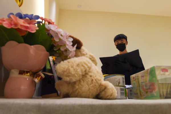↑ 4月1日,谷铭泽陪自己的宠物狗玩耍。