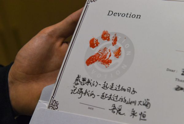 ↑ 4月1日,谷铭泽展示宠物离世时留下的爪印和主人寄语。