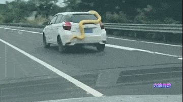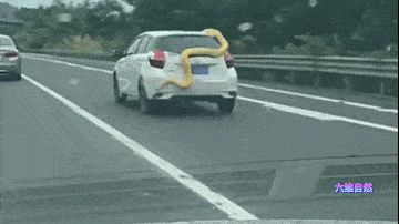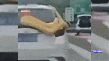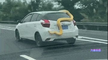 司机跟车一段距离,目测 这条黄金蟒3米以上,几十斤重,由于车速太快,这条黄金蟒在车顶车尾之间不断爬动,明显有些支撑不住,力量不足让黄金蟒从车顶掉落了。