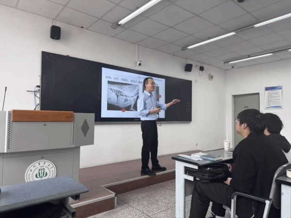 课堂上,李先波围绕宠物肿瘤规范化诊疗,结合真实病例系统讲解犬猫常见肿瘤的早期识别、病理诊断、手术方案及综合治疗策略,将临床思维、操作规范与动物福利融入教学,帮助学生构建完整的诊疗逻辑。丁明飞聚焦宠物牙病防治,详细讲解牙周病、口腔感染等规范诊疗流程,分享超声洁治、拔牙等实用技术,与课程理论有效衔接,提升了学生的临床认知与实操能力。