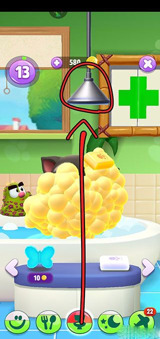 6、如果你发现汤姆猫变得脏兮兮的话就要给汤姆猫洗澡,点击厕所里的浴缸,汤姆猫就会到浴缸里去,我们挑选一个肥皂给汤姆猫洗澡。等汤姆猫全身的是泡泡的时候我们再拿汤姆猫头上的花洒冲掉泡泡。