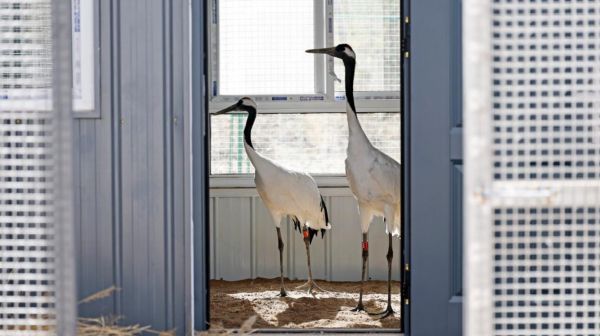 4月9日,在宁夏青铜峡库区湿地自然保护区丹顶鹤标准化适应性训练场,工作人员为丹顶鹤准备食物。4月9日,8对国家一级保护野生动物丹顶鹤跨越千里,从黑龙江扎龙国家级自然保护区运抵宁夏青铜峡库区湿地自然保护区,开启了黄河流域丹顶鹤种源迁地繁育新篇章。