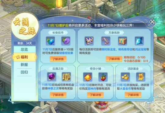 云涌之际活动将于11月7日上线,少侠需在野外帮助陷入困境的百姓,每日完成5次有机会获得神兽之灵、三级护符重置丹、高级魔兽要诀等稀有奖励。