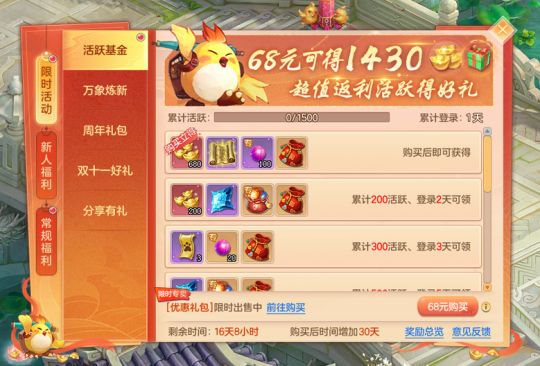 活跃基金活动享超值返利!活跃基金活动11月7日上线。少侠购买活跃基金,不仅能立即获得等额的金币,还有高级魔兽要诀、还童丹等资源;后续登录游戏,更可解锁加码金币、域外寒晶和洗宠强化符等丰富好礼!*已拥有成长基金的少侠可正常购买
