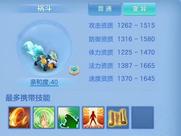 我们可以看到,变异祸斗的各方面资质都很高,尤其是1665的法力资质和1645的速度资质,双双达到了125级宠物不曾触及的高度。它还有着1580的防御资质和1515的攻击资质,可谓是攻击防御两不误。体力资质虽然上限和其他几项相比略微逊色,但也与125级宠物的普遍水平持平。总的来说,祸斗的资质面板非常不错。接下来我们看一看它所携带的特殊技能。