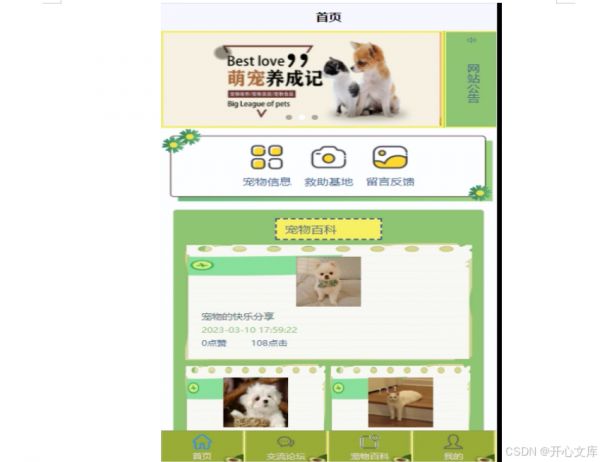 当进入Pettingpets(爱抚宠物) 小程序的时候,首先映入眼帘的是系统的导航栏,下面是轮播图以及系统内容,其主界面展示如下图4-1所示。