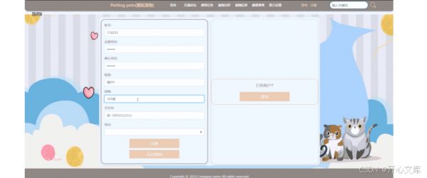 Pettingpets(爱抚宠物) 小程序的员工可以进行注册登录,当用户左上角“注册”按钮的时候,当填写上自己的账号+密码+确认密码+昵称+邮箱+手机号,选择身份,然后填写身份信息后再点击“注册”按钮后将会先验证输入的有没有空数据,再次验证密码和确认密码是否是一样的,最后验证输入的账户名和数据库表中已经注册的账户名是否重复,只有都验证没问题后即可注册成功。其用注册界面展示如下图4-3所示。