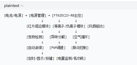 智能宠物净味器方案,是一套专为猫砂盆、宠物窝等场景设计的高集成、低功耗、低成本的完整解决方案。该方案以 FT62EC23-RB 为主控,集成红外感应、等离子 / 负离子净化、风扇驱动、定时管理、电量监测五大核心功能,实现宠物靠近自动启动、离开延时停止、智能净化与节能续航