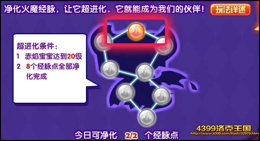 a、一级进化:每天成功挑战赤焰宝宝即可净化1个经脉点,每天最多能净化2个,当8个经脉点全部净化完成,且赤焰宝宝达到20级,就可以开启魔焰侍者进化