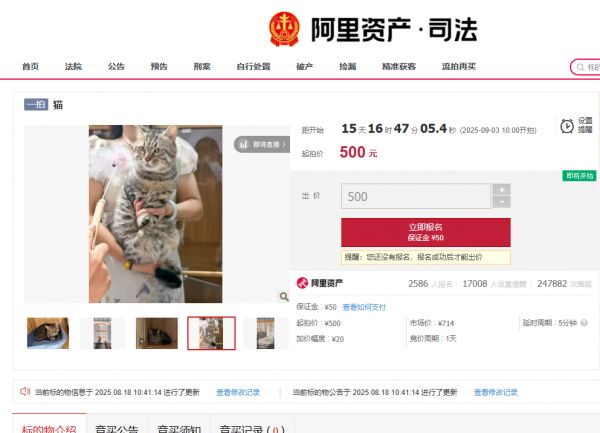 8月18日,大河财立方记者在阿里司法拍卖平台查询到,被拍卖的猫是一只狸花公猫,未做绝育,已经注射狂犬、妙三多(主要用于预防猫瘟、猫鼻支和猫杯状病毒这三种高传染性疾病)等疫苗。目前这只狸花猫健康状况良好,本次拍卖计划于今年9月3日上午10时开始。