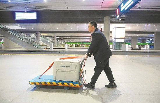 工作人员将宠物经安检后运送到列车上。