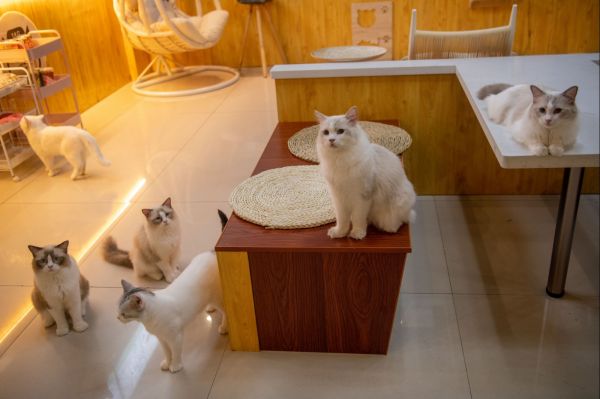2021年9月15日,海南省琼海市嘉积镇一家“猫咖”拍摄的猫咪。在海南省琼海市嘉积镇富海路上,最近出现一家装修精致的“猫叔”的小茶馆,内面有蓝猫、银渐层、布偶、起司、鲁白花等“舶来猫”10多只。老板是位内地人,因为喜欢宠物开设了这间“猫咖”,通过可爱、粘人的猫咪招揽顾客,再靠餐食、猫用品等增值服务来赚钱。走进茶馆更象是进入了猫的乐园,呆萌的猫咪见到客人也不生疏,总是一齐围拢过来任由人们抚摸搂抱,从而索取食物。猫咪憨态可掬的动作和眼神不时引发茶客开心的欢笑。