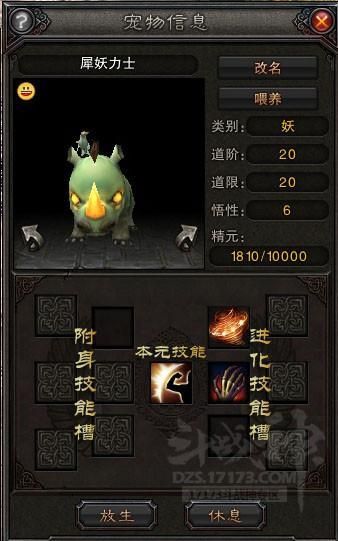 进化技能槽:通过宠物升级才有几率领悟的技能槽。通过宠物融合有几率获得更多技能槽,目前进化技能无法遗忘。