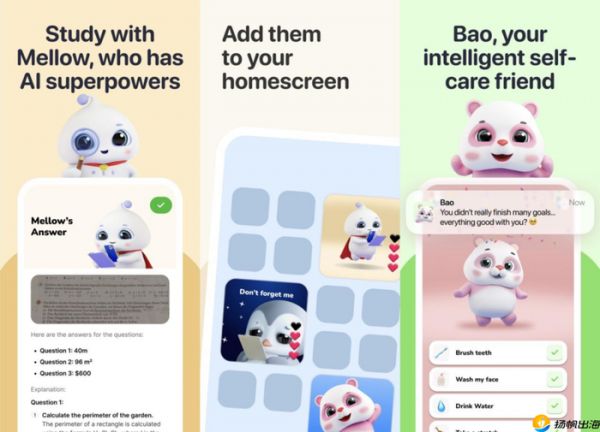 应用中将电子宠物分为了3种,包括与好友共同养育的企鹅Pengu、形象类似水滴的AI学习伙伴Mellow、以及粉色熊猫外表的AI关怀伴侣Bao。