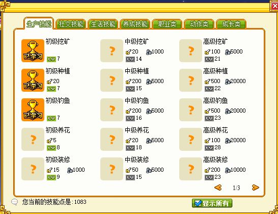 然后我们可以看见非常多的技能,每个技能都由技能名字、LV(需求等级)、 需求技能点、需求的银币组成。