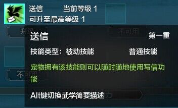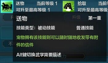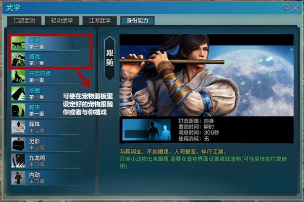 六、按P呼出技能界面,在身份技能中找到跟随和嬉戏,使用这个两个技能可使宠物跟随角色或是与角色进行玩耍。