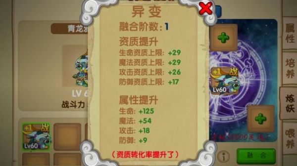高阶融合对异变宠物属性提升显著。每升一阶,资质转化率进一步提高,被动技能效果增强,且融合阶数直接影响万灵幻境副本的战斗力。若使用聚灵蛋替代副宠材料,可降低资源消耗,但需通过万灵幻境副本获取该道具。
