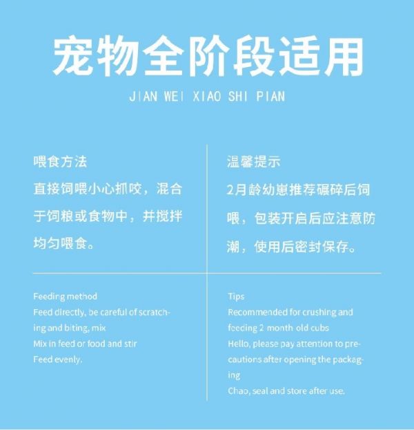 我们的健胃消食产品采用复合消化酶配方,涵盖了蛋白酶、脂肪酶、淀粉酶、纤维素酶以及乳糖酶。这些酶类能够匹配宠物日常食物中的主要营养成分,将大分子食物彻底分解为易于吸收的小分子。无论是肉类蛋白、脂肪,还是谷物淀粉、植物纤维,甚至乳糖不耐受问题,都能得到有效解决。宠物不再因食物消化不充分而出现积食、腹胀、呕吐或便秘,从源头改善消化效率,让每份营养都被充分利用。本产品不仅注重消化,更着眼于肠道长期健康。我们创新性地将宠物高活性益生菌与优质益生元融入配方。益生菌(如嗜酸乳杆菌、两歧双歧杆菌)能直接补充肠道有益菌群,抑制有害菌生长;益生元(如低聚果糖、甘露寡糖)则能作为益生菌的“食物”,促进其在肠道内大量繁殖。这种“酶+益生菌+益生元”三位一体的配方,实现了消化与肠道微生态的双向深度调理,为宠物构建坚不可摧的肠胃健康防线。健胃消食剂/片是宠物日常保健的理想选择,对于食欲不佳、消化力较弱,或换粮、应激期间的宠物,它能起到积极的预防和改善作用。定期在宠物饮食中添加,可有效预防积食、消化不良,刺激胃口,让宠物对食物保持旺盛的兴趣。长期使用,能稳定消化功能,提升营养吸收,让宠物毛发更亮泽,精神更饱满。