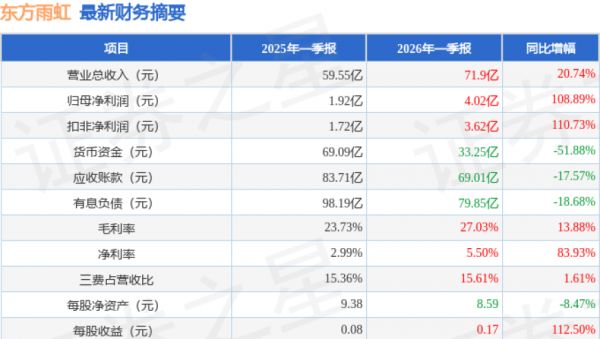 东方雨虹(002271)2026年一季报简析:营收净利润同比双双增长,盈利能力上升