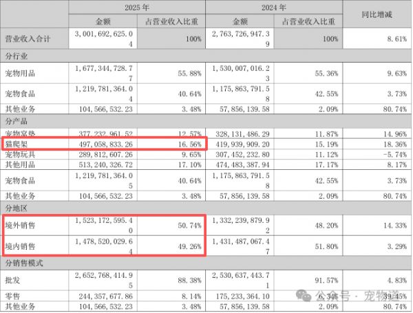 公开资料显示,天元宠物以宠物用品的设计开发、生产和销售业务为基础,积极拓展宠物食品销售业务,产品涵盖了宠物窝垫、猫爬架、宠物食品、宠物玩具、宠物服饰、电子宠物用品等多系列、全品类宠物产品。报告期内,宠物用品板块营收16.77亿元,占比55.88%;宠物食品板块营收12.20亿元,占比40.64%。其中,大单品猫爬架创收4.97亿元,占总营收16.56%。