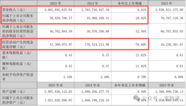 宠物道消息,4月17日,天元宠物(301335.SZ,市值33.74亿元)发布2025年年度报告,报告期内,公司实现营业收入30.02亿元,同比增长8.61%;实现归属于上市公司股东的净利润5884万元,同比增长28.02%;经营活动产生的现金流量净额4130万元,较2024年大幅减少76.60%(主要系公司宠物食品的期末预付金额增加所致)。