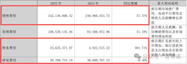 报告期内,销售费用3.42亿元,同比增长37.37%,占比总营收11.40%,增长主要系市场推广费用、电商平台费用及销售人员薪酬增长所致;财务费用大幅增长581.71%。