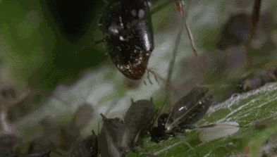 如果你看到蚂蚁成群结队地爬到你花园植物的叶子下,请不要惊慌,它们并不是在捕食植物的叶子,而是在等树叶上蚜虫群产生的蜜露。