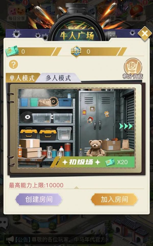牛人广场有单人模式和多人模式两种玩法。多人模式分档设置限制,充分考虑到不同玩家的竞技需求。参与对局需要消耗对应场次门票,门票可以在积分商店购买。