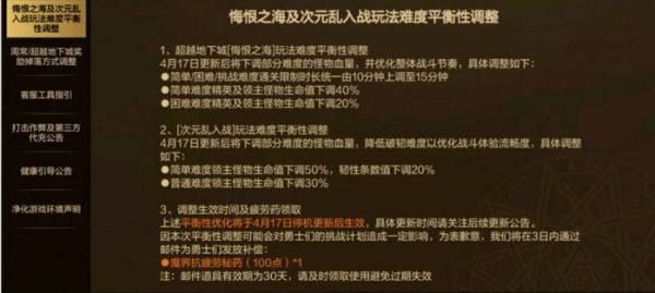 不过不用慌了,策划发布公告了,紧急削弱悔恨之海和次元乱入战,本周五更新上线,想体验高难度的兄弟,现在可以去体验一下。打不过的兄弟可以等周五更新后再打。