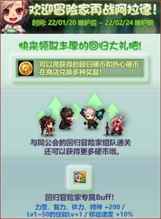 活动期间,回归的勇士将会得到专用BUFF:力量/智力/体力/精神 +200, 1~50技能Lv +1, 移动速度 +10%。