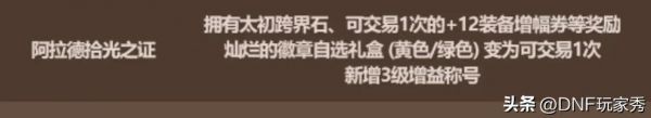 【阿拉德拾光之证】玩法和之前的金秋礼包一样,核心奖励“太初跨界石、可交易红12券”。