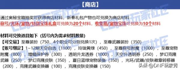 【新春商店兑换】奥秘硬币玩法可得商店材料、多余的新春产物也可以换材料,然后在商店兑换,核心道具“可交易至尊装扮、可交易至尊武器装扮”、还有账号绑定的“1-12天空自选、至尊称号/宠物附魔”等。