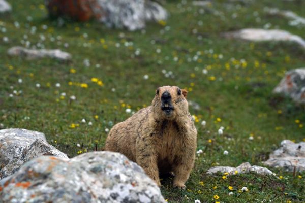 2024年7月13日,巴尔斯雪山景区的一只旱獭。新华社记者 马宁 摄