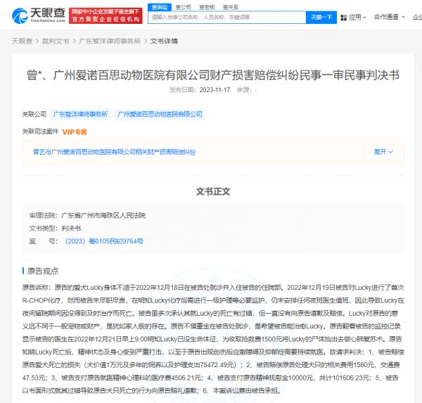 天眼查法律诉讼信息显示,该公司曾因服务合同纠纷、财产损害赔偿纠纷被起诉。相关文书显示,原告曾某诉称,爱犬Lucky身体不适住院,然而被告未尽职尽责,在明知Lucky化疗后需进行一级护理等必要监护,仍未安排任何夜班医生值班,导致Lucky在夜间留院期间没得到及时治疗而死亡。法院认定,被告承认存在值班医生中途自行离开工作岗位的情况,存在一定过错,酌情认定被告应承担40%的赔偿责任。最终,法院判决该动物医院赔偿曾某7419元。