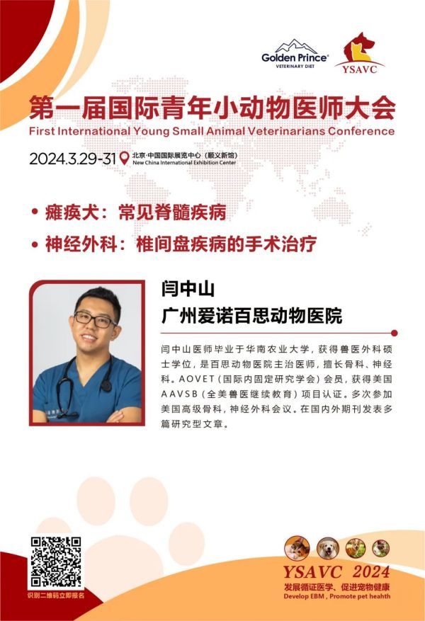 专职神经科、外科医师,毕业于华南农业大学,获得兽医外科硕士学位,擅长骨科、神经科。AOVET(国际内固定研究学会)会员,获得美国AAVSB(全美兽医继续教育)项目认证。多次参加美国高级骨科,神经外科会议,3月30日下午,闫医师将在【外科&影像专科】分别为大家带来以“瘫痪犬:常见脊髓疾病”和“神经外科:椎间盘疾病的手术治疗”为主题的课程知识分享,帮助感兴趣或从事相关行业工作的小伙伴了解更多“瘫痪犬:常见脊髓疾病”,并了解“椎间盘疾病的手术治疗”,学习更多新方法,为日常工作中遇到的疑难问题提供新思路,新方法。