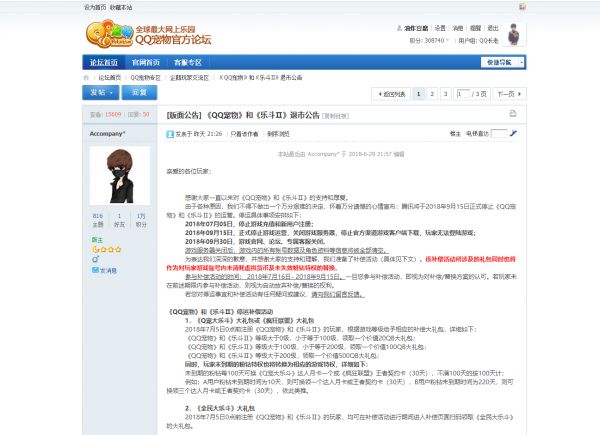 腾讯于6月29日当晚发布公告宣布《QQ宠物》和《大乐斗2》即将停止运营的公告。