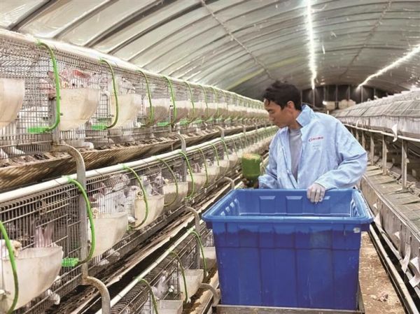 近日,记者走进当地肉兔养殖基地,7000余个兔笼整齐排列,水帘恒温系统让兔舍四季保持在20-25℃。基地负责人刘本俊正穿梭其间,查看兔群长势。“我们引进的法国伊普吕肉兔,70天即可出栏,用料少、长得快、抗病强。”他笑着说,今年新增的E系麻兔,出肉率提高10%,肉质鲜嫩,很受市场欢迎。