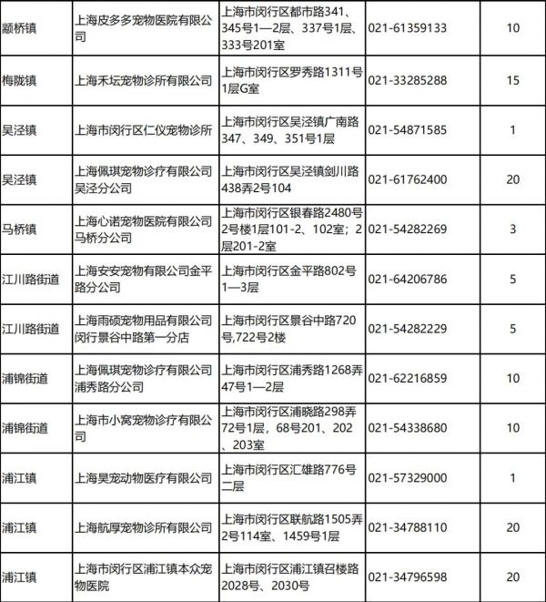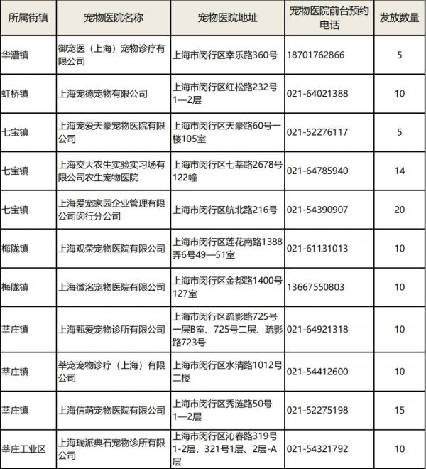 除了线上申请渠道外,闵行宠物服务协会于3月还下发了219个名额到新虹街道、古美路街道、江川路街道、浦锦街道、华漕镇、吴泾镇、莘庄镇、虹桥镇、颛桥镇、七宝镇、浦江镇、马桥镇,现在还有少量余额,有需要的可以咨询所在居委。