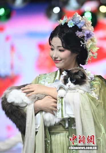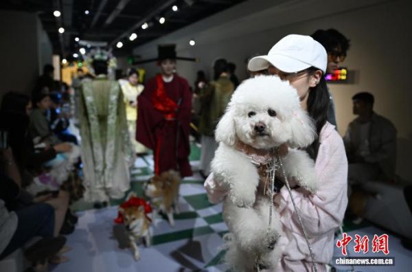 4月18日,宠物主身着古装展示宠物。当日,第三届杭州宠物时装周在浙江杭州时尚中心启幕,不少宠物主携带萌宠盛装出席“Pet Gala”宠物风尚大秀,吸引市民观看。中新社记者 王刚 摄