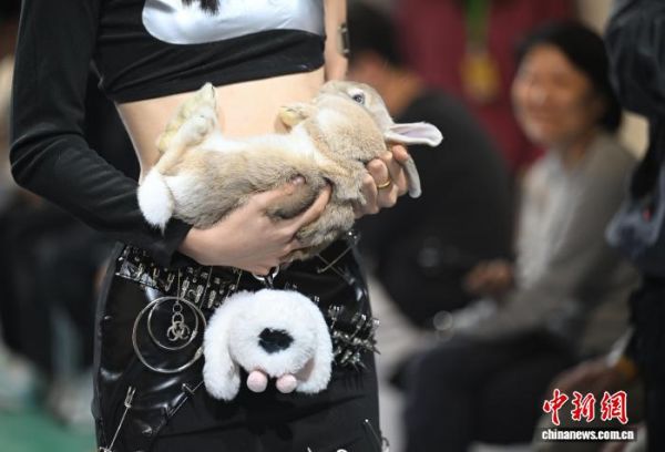4月18日,宠物主怀抱兔子、挂着AI宠物机器人走秀展示吸引参观者。当日,第三届杭州宠物时装周在浙江杭州时尚中心启幕,机器狗、AI宠物机器人等颇具科技感的“宠物”进行T台展示。中新社记者 王刚 摄