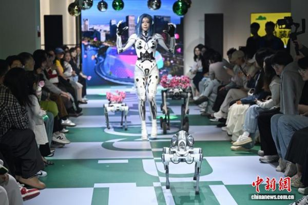 4月18日,内置AI应用、可与人互动的宠物机器人亮相展示。当日,第三届杭州宠物时装周在浙江杭州时尚中心启幕,机器狗、AI宠物机器人等颇具科技感的“宠物”进行T台展示。中新社记者 王刚 摄