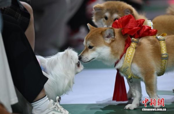 4月18日,宠物们在走秀中互动。当日,第三届杭州宠物时装周在浙江杭州时尚中心启幕,不少宠物主携带萌宠盛装出席“Pet Gala”宠物风尚大秀,吸引市民观看。中新社记者 王刚 摄