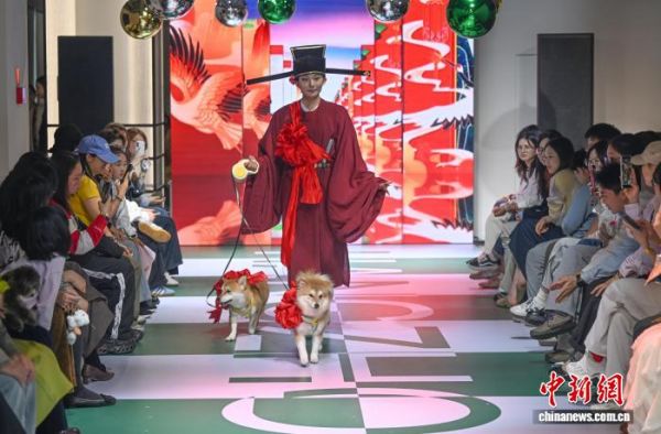 4月18日,宠物主牵着宠物盛装走秀。当日,第三届杭州宠物时装周在浙江杭州时尚中心启幕,不少宠物主携带萌宠盛装出席“Pet Gala”宠物风尚大秀,吸引市民观看。中新社记者 王刚 摄