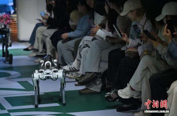 4月18日,“T台走秀”的机器狗吸引参观者。当日,第三届杭州宠物时装周在浙江杭州时尚中心启幕,机器狗、AI宠物机器人等颇具科技感的“宠物”进行T台展示。中新社记者 王刚 摄