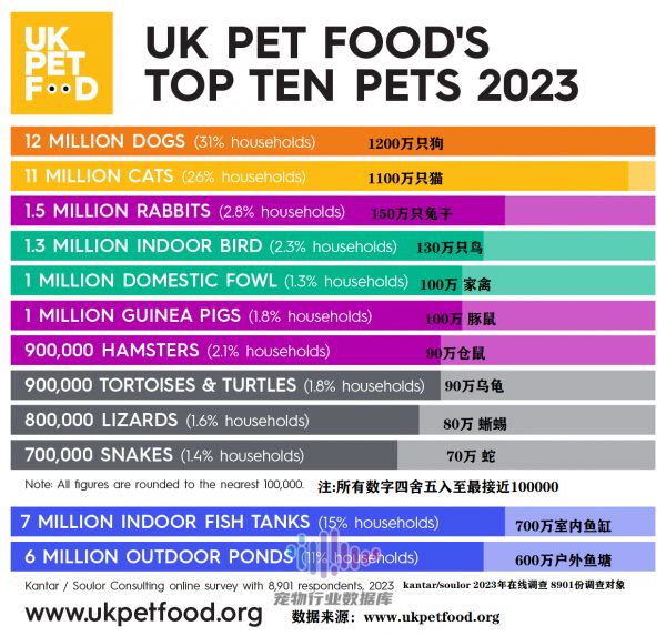 狗仍然处于首位,英国有1200万人口,31%的英国家庭至少有1只狗。与前一年相比,狗的数量减少了100万只。
