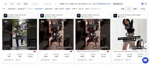 同时,Dance AI也在买量上投入了较多资源。产品正式上线约两个月,广大大数据显示,其在iOS与安卓双端可查的相关广告数达到3.2万,严格去重后约为6948条。