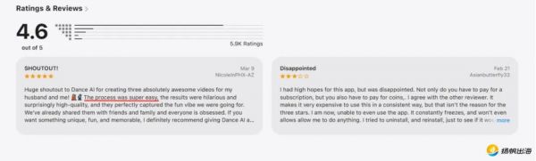 Dance AI在iOS商店用户评分与评论。图源:APP Store