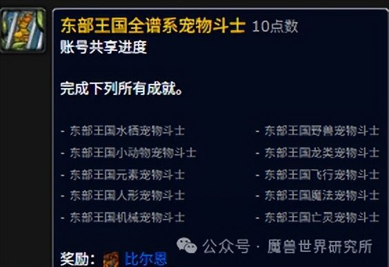 这是一项综合成就,需要同时完成东部王国和卡利姆多两大区域的对应成就。完成后,可获得一款独特的宠物指令玩具。